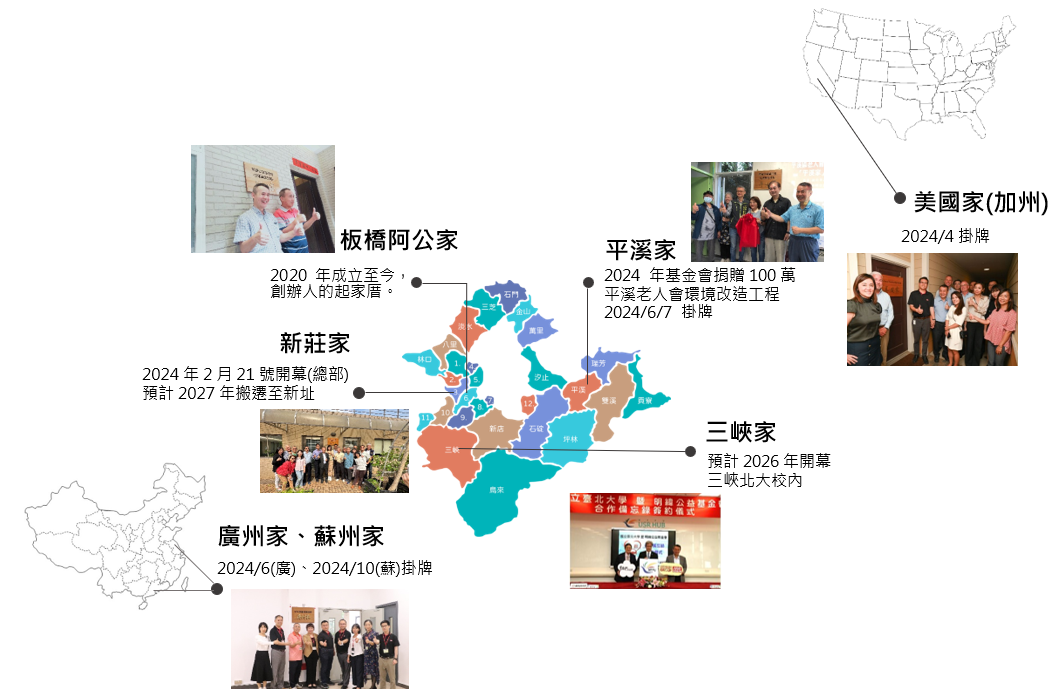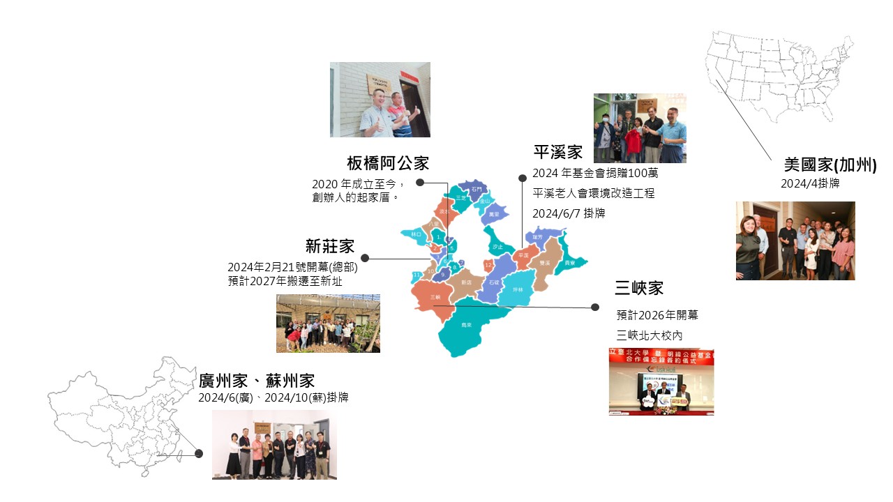 社區據點活動,以板橋阿公家為出發點,擴展至各地,目前台灣已有阿公家、新莊家、平溪家、三峽家;海外已有美國家(加州)、廣州家、蘇州家。