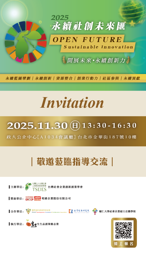 台灣社會企業創新創業學會將於今年11月30日在政大公企中心,舉辦2025永續社創未來匯,主張「開展未來,永續創新力」,希望能藉由這個活動,挖掘更多社會創新創業的力量,進行主題發表並公開表揚,支持社會創新組織在實踐的路上前行。