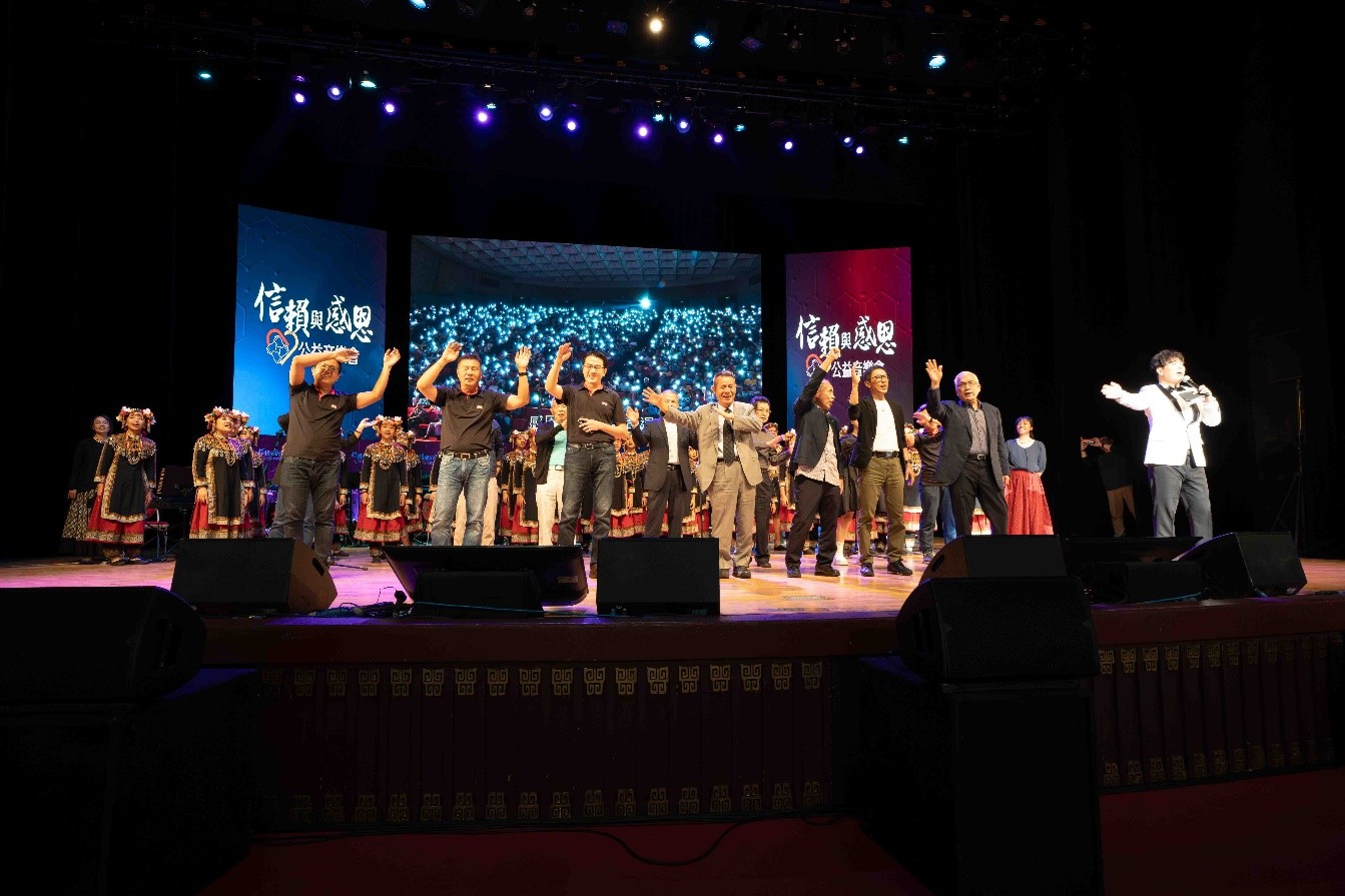 ▲2023年「信賴與感恩公益音樂會」創辦人林國棟先生與經營團隊與嘉賓同台互動,為活動掀起最高潮。