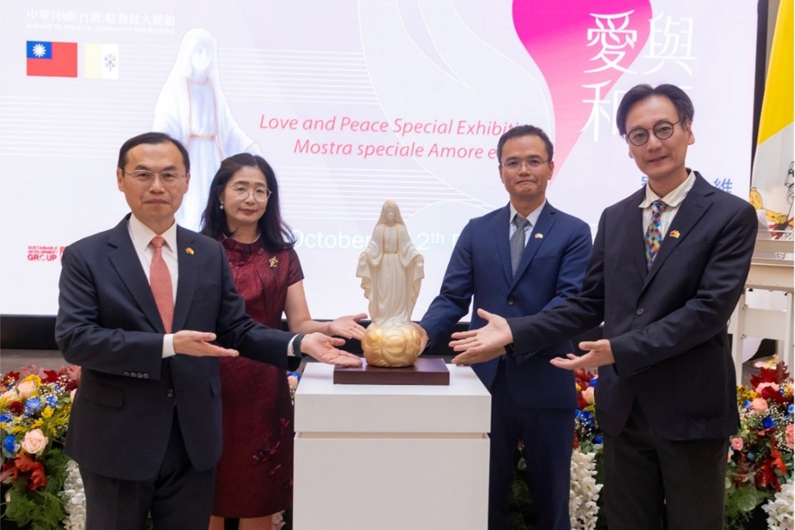 ▲賀忠義大使夫婦(左)、藝術家羅廣維先生(右前)及歐洲明緯代表劉方伯董事長(右後)與聖母鹽雕像合照